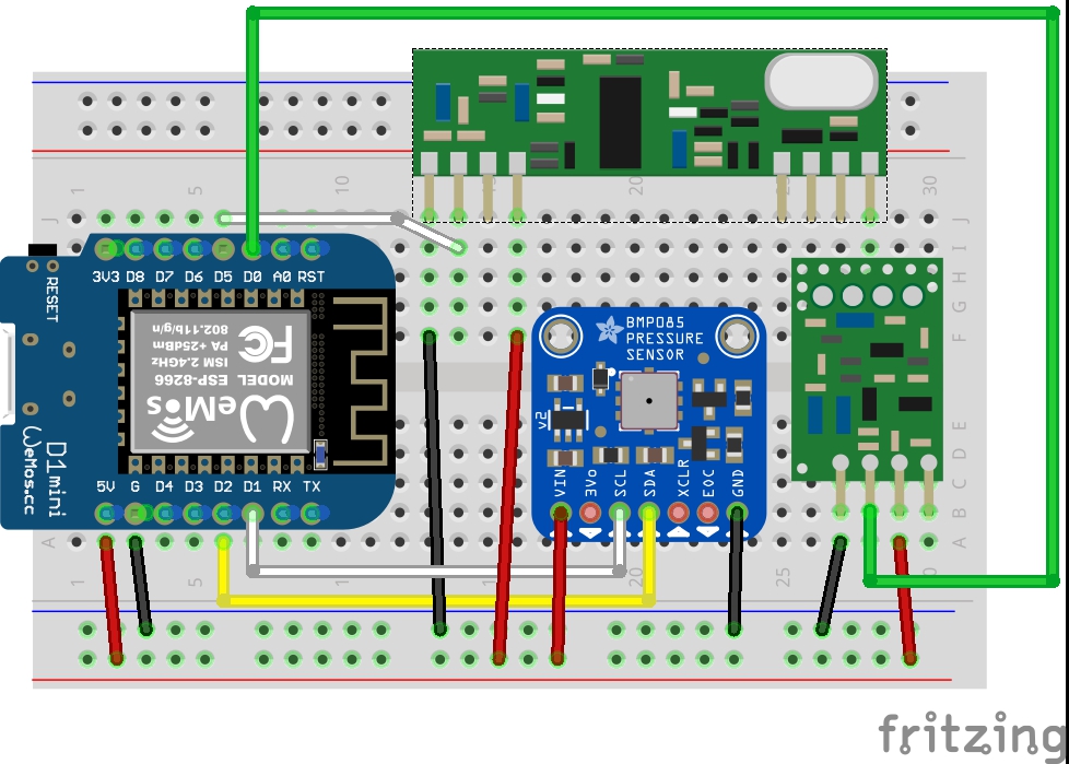 | Wemos D1 mini | BMP085 | RF Receiver | RF Transmitter |